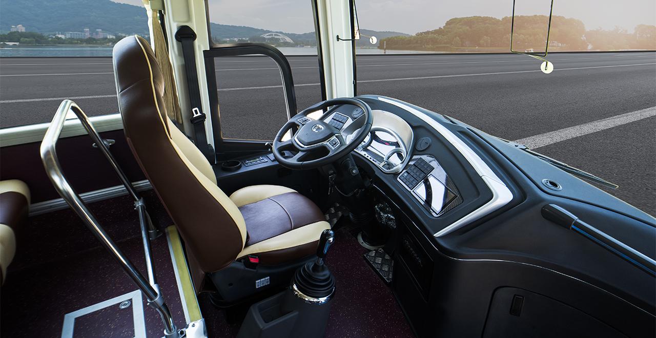 Nội thất của các dòng sản phẩm xe bus ghế ngồi được nghiên cứu thiết kế tinh giản mà đầy sang trọng. Hệ thống đèn trần cùng họa tiết chiếu sáng đa chiều với cường độ được điều chỉnh linh hoạt tạo không gian rộng rãi, năng động. Khoang lái bố trí cần số và cụm công tắc khoa học. Ghế lái chỉnh hơi 8 hướng, 4 vị trí điều chỉnh đệm lưng giúp người lái thoải mái điều khiển xe. Đồng hồ taplo mang kiểu dáng thể thao, kết hợp màn hình LCD kích thước lớn 7’’ hiển thị đầy đủ các thông tin, hình ảnh sắc nét. Ngoài ra, sản phẩm còn trang bị các tiện ích cao cấp như: sạc USB, khay để ly, bàn ăn. Hệ thống âm thanh 4 loa nghe nhạc Massive cho âm thanh hoàn hảo. Đèn chiếu sáng được thiết kế tính năng sáng/tắt chậm mang đến cảm giác thoải mái cho hành khách trên suốt hành trình.